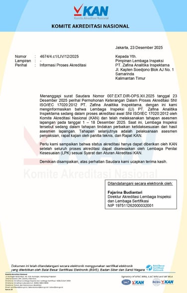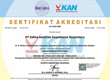 PT Zafina Analitika Inspektama provides comprehensive technical services benchmarked against international quality standards. We integrate ISO/IEC 17020:2012 to guarantee independence and consistency in every field inspection, alongside ISO/IEC 17025:2017 to ensure the validity of laboratory testing results.